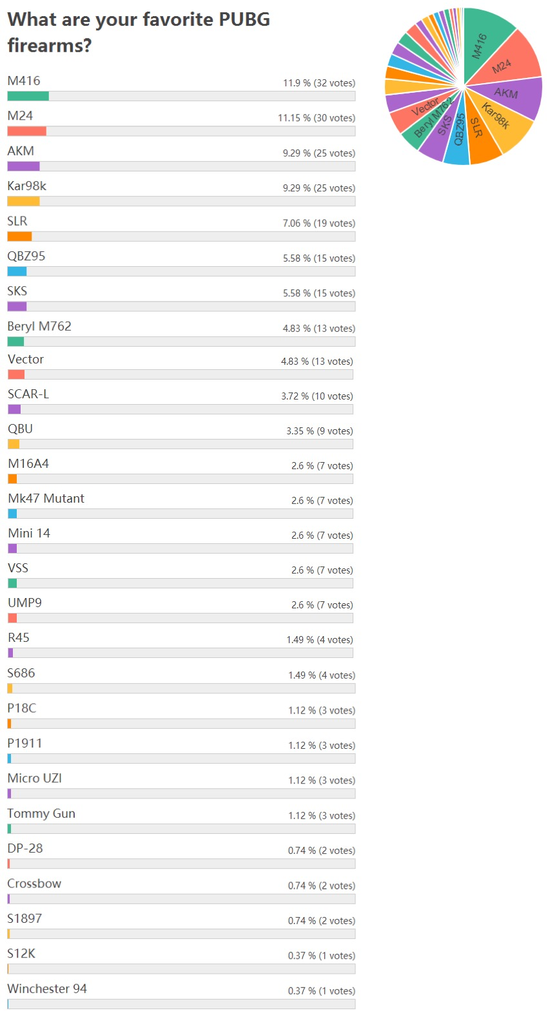 Reddit网友发起PUBG你最喜欢的枪支评选活动,自动步枪M416暂列第一,其他的自动步枪AKM以9.29%的喜爱率暂居第三,射手步枪SLR排名第五。M24和Kar98K分列第二和第四位。