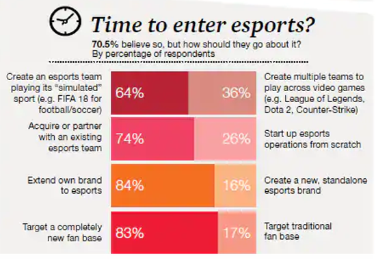 在传统体育如何进军电竞行业方面,四项建议得到了大多数体育领域方面专家的认可。品牌植入和关注全新粉丝群体是最具效果的切入点,其次与现有电竞团队展开合作也是行之有效的举措。此外根据现有的经验,如 FIFA游戏的成功,研发新的“模拟”传统体育项目的电子游戏也值得尝试。