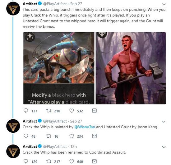 今天,Artifact官方表示“Crack the Whip”这张卡牌正式改名为“Coordinated Assault”(协同攻击)。