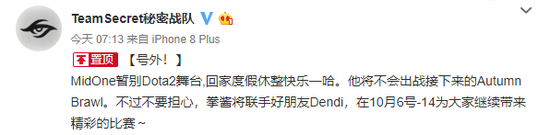 之前,秘密官方宣布MidOne在PVP电竞大奖赛后将会短暂休息一段时间,而Puppey会邀请一位老朋友作为Secret战队替补参加即将开始的Autumn Brawl大赛。今天,秘密官博宣布,老司机Dendi成为了队伍的临时替补选手。