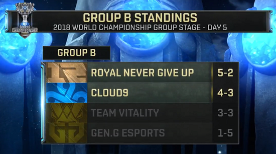 2018年10月14日,英雄联盟S8全球总决赛进入第五日,B组结束了全部赛程。最终LPL头号种子RNG加赛夺得小组第一,C9紧随其后。卫冕冠军Gen.G则以1胜5负的战绩垫底出局。