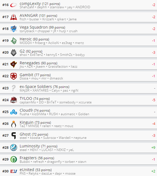 与之相对应的,TYLOO的排名下滑到了24名,下跌五名。TYLOO需要参加更多的比赛来冲击更高的排名。