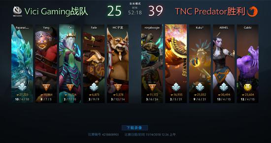 VG与TNC在淘汰赛阶段再度遭遇,首局比赛VG开局劣势,TNC选择的狼人体系前期攻势如潮,不过VG的灰烬之灵扛住了局势,中期无限超神,为天穹守望者的发育争取了时间。最终,VG团队发育成型,TNC被逐个击破打出GG。然而第二局,VG面对TNC的幽鬼凤凰体系团战中极其被动,随着TNC一波撼地者完美跳大,两队战成一比一。决胜局,TNC虚空假面的出色发挥为团队建立优势,虽然中期VG的变体精灵通过守高补上了经济,但是一波追杀中被虚空假面反手击杀,之后买活阵亡,VG无奈打出GG。