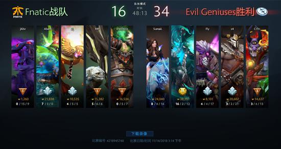 首局比赛,EG再次为rtz选出昨天表现出色的天穹守望者,Fnatic则使用炼金术士来比拼发育速度。对线期EG就取得优势,虽然中期局势有所反复,但是随着天穹守望者发育成型,Fnatic还是败下阵来,EG先取一分。第二局,EG则选用了另一后期英雄恐怖利刃,虽然前期双方没有拉开差距,但是团战中EG的先手和控制能力更足,通过团战,EG建立优势再难逆转。神装恐怖利刃推上Fnatic高地,Fnatic无力抵挡,最终只能打出GG。