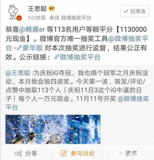 前天王校长在微博公布了第二波抽奖内容:转发微博抽送67套纪念版手机壳(总决赛三把共67个人头),并附赠iPhone XS Max 256GB手机一台。手机壳包含黑白两款iG纪念图案,还有火爆全网络的“王思聪吃热狗”图案。