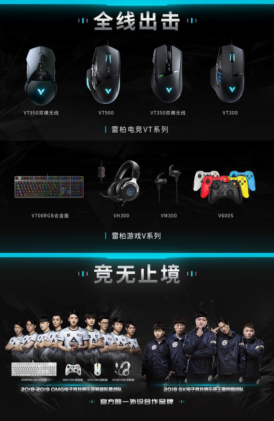 不断革新,升级核心技术,雷柏游戏深耕电竞领域,不仅全面涉足游戏电竞事业,与知名电竞战队(包括皇族战队、GT战队、OMG战队、AS仙阁战队、GK战队)、人气电竞明星(Miss韩懿莹、Misaya若风禹景曦)、全国重大电竞赛事(NEST、IET)、电竞教育(FFF培训基地)展开深度合作,更是与职业选手探讨游戏操作体验,联手推出了Uzi定制版、Zhou定制版、Miss定制版、OMG战队定制版等多款主题产品,持续为玩家用户打造定制专属游戏梦想。