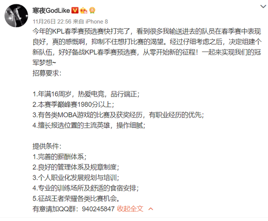 今天,原AS仙阁、AG超玩会教练寒夜发博招募队员,表示组建个新队伍,好好备战KPL春季赛预选赛,从零开始新的征程!