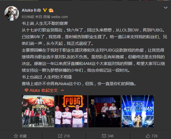 从十七岁打职业到现在,快六年了,回过头来想想,从LOL到OW,再到PUBG。已经第6年了,我觉得,是时候告别职业生涯了。给一直以来支持我的粉丝们、兄弟们说一声,从今天起,我正式退役了。