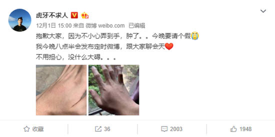 12月1日,就在朋友圈频刷“12月对我好一点”的时候,不求人并没有发,显然12月对他不太好。不求人发了条微博向粉丝请假,原因是他不小心把手弄伤了,无法直播。