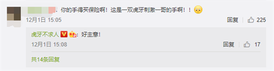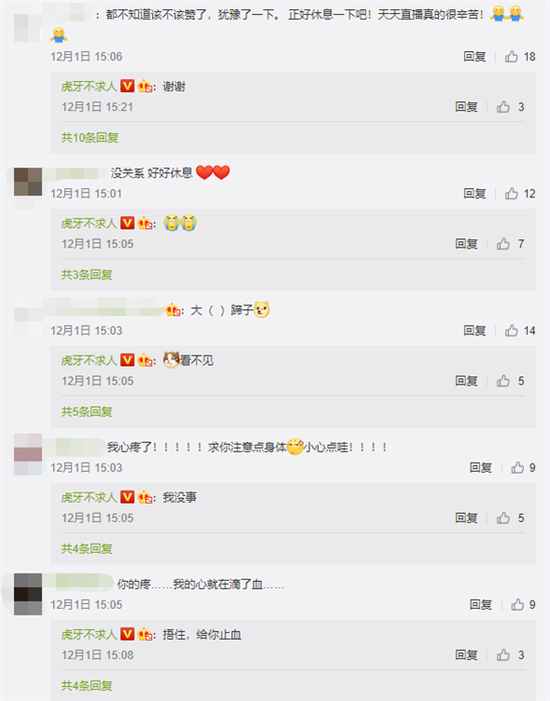 其他评论也没有责怪不求人停播,字里行间都非常心疼不求人:“你的手得买保险啊!这是一双虎牙刺激一哥的手啊!!”“我的天!你是故意的么?看完了你YouTube上所有的视频粉上了你,10mins前刚下载了虎牙准备守你晚上直播!结果在微博就瞅见了这让人心碎的消息。” “求哥今晚休息我就能安心游戏了,你一开播我游戏都不想打,只想看你那骚样。”