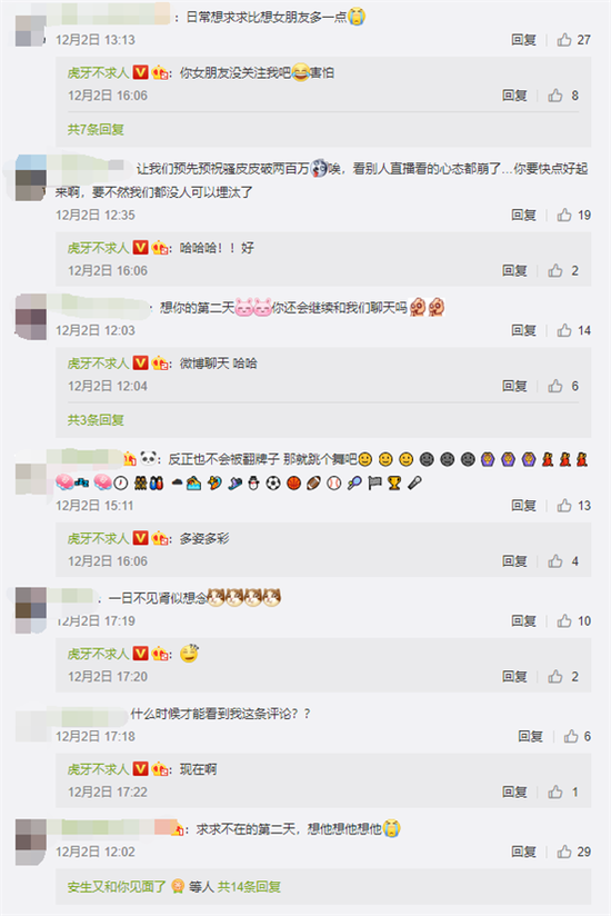 留言里无不展示出粉丝们对不求人的喜爱,停播一天的不求人,收到了很多私信,粉丝表示没有不求人的第一天,想他,想他,想他。。。于是他们迎来了不求人不在的第二天,12月2日,不求人再次发文向粉丝请假:“刚看完医生,医生建议今天再休息一天,还没有完全消肿。”