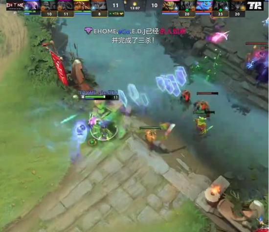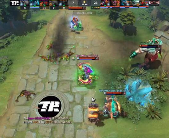 17分钟EHOME扑到天辉上路野区杀死凤凰和蓝胖,凤凰买活,EHOME还是要打,凤凰变蛋掩护幻影刺客切掉了莱恩,猛犸大到三人却无人能接输出,TR再杀猛犸。