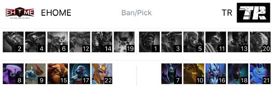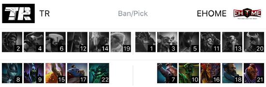 TR在天辉方,EHOME在夜魇方。分路方面,Super的黑鸟在中路对阵ASD的船长。下路是妖精的幻影刺客和ddc的蓝胖对阵Faith_bian的猛犸和天命的莱恩。上路是Yao的凤凰和维多利亚的拉比克对阵eGo的敌法师和y的尸王。