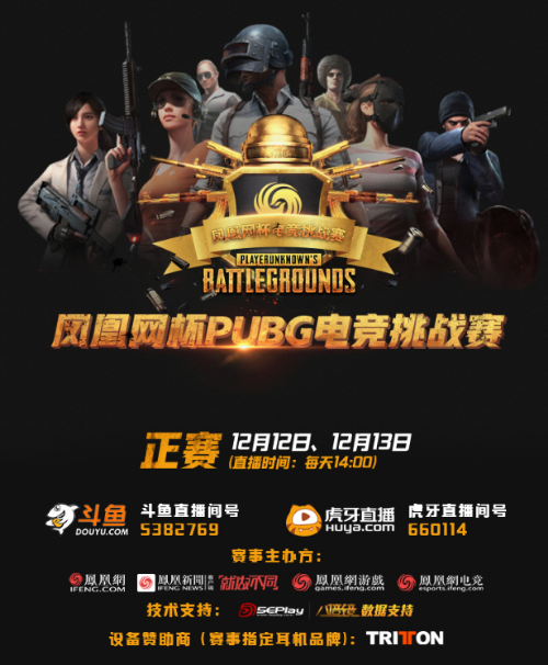 传统豪强,新兴黑马同台竞技,共同为你奉上两个比赛日紧张刺激的电竞盛宴。决赛将在12月12~13日战火重燃,王者宝座,虚位以。豪强林立悉数登场,全新赛制紧张刺激,同时新晋解说小葵、专业解说越越将再次全程陪你观看决赛,为你带来连贯充实的观赛体验,专业透彻的赛事复盘,更有丰厚奖品等你来拿,战火即将重燃,成败一瞬之间。快来与凤凰网一道共享电竞的盛宴,感受PUBG给你带来别具一格的赛事体验。届时大家可以通过虎牙直播、斗鱼直播观看凤凰网杯PUBG电竞挑战赛,风直播客户端搜索“凤凰网杯PUBG电竞挑战赛”即可,为你喜欢的队伍加油助威吧!