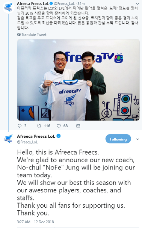 英雄联盟LCK联赛Afreeca Freecs宣布签入前EDG主教练NoFe。