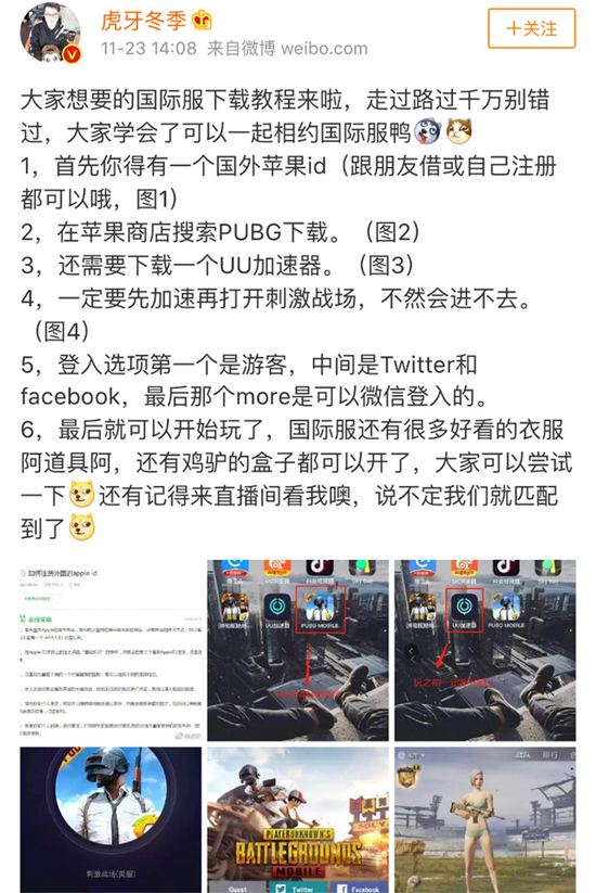 冬季经常在微博上做三件事情:分享教学视频、分享美食、讲冷笑话。除了第一件分享教学视频显得比较正经以外,其他两件事情都有点贱兮兮的感觉,毕竟我们没办法去他家里蹭吃蹭喝,讲个冷笑话也不直接说答案,还要让我们猜,你说气不气?不过细心的冬季可是每天都仔细看着网友们的评论的,就是想知道大家都喜欢什么样的微博内容,他就发什么样的微博内容。比如前段时间,冬季在刺激战场国际服体验了一把,立马就有许多网友来问国际服的下载方式,冬季很是耐心地整理出了步骤来教大家下载游戏。