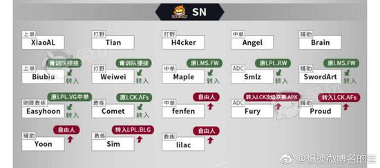 在转会期的最初阶段,SN首先宣布了原下路组合Fury、Yoon,中路Fenfen,以及教练Sim和Lilac的离队。上单狼行、打野H4cker这两位实力强劲的选手,以及新人中单Angel留队。SN战队在2018赛季中本就遭受下路弱势、后20分钟运营劣势的诟病,面对搭配已久下路组合的突然更换,SN急需引进强势下路来弥补不足。