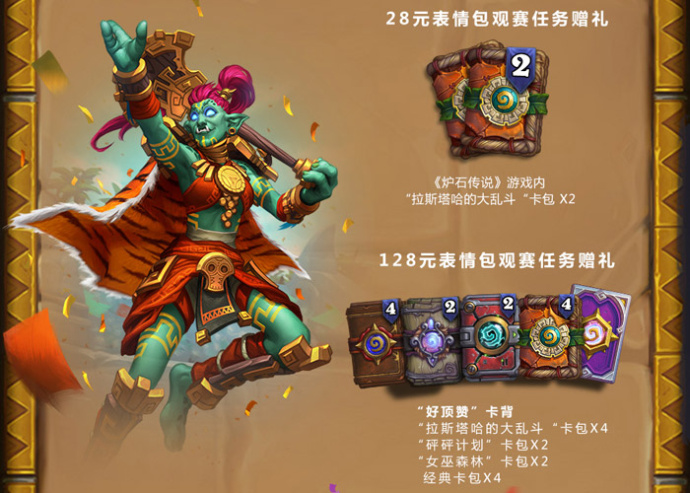 这次的观赛礼包被分为28元和128元两个档位。购买直播平台28元观赛礼包的玩家,完成任务后可以获得“拉斯塔哈的大乱斗”卡包X2;购买128元观赛礼包的玩家,完成任务后可以获得“拉斯塔哈的大乱斗”卡包X4、“砰砰计划”卡包X2、“女巫森林”卡包X2、经典卡包X4以及“好顶赞”卡背X1。除此之外,全国助威热度达到1000万后,所有购买礼包的用户都可以获得一包限定黄金卡包。
