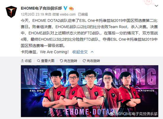 2019年2月22日波兰卡托维兹,ESL One系列赛再开。依然是30万美元的总奖金和MVP奔驰车奖励,希望EHOME和Aster能够在比赛中取得好成绩。