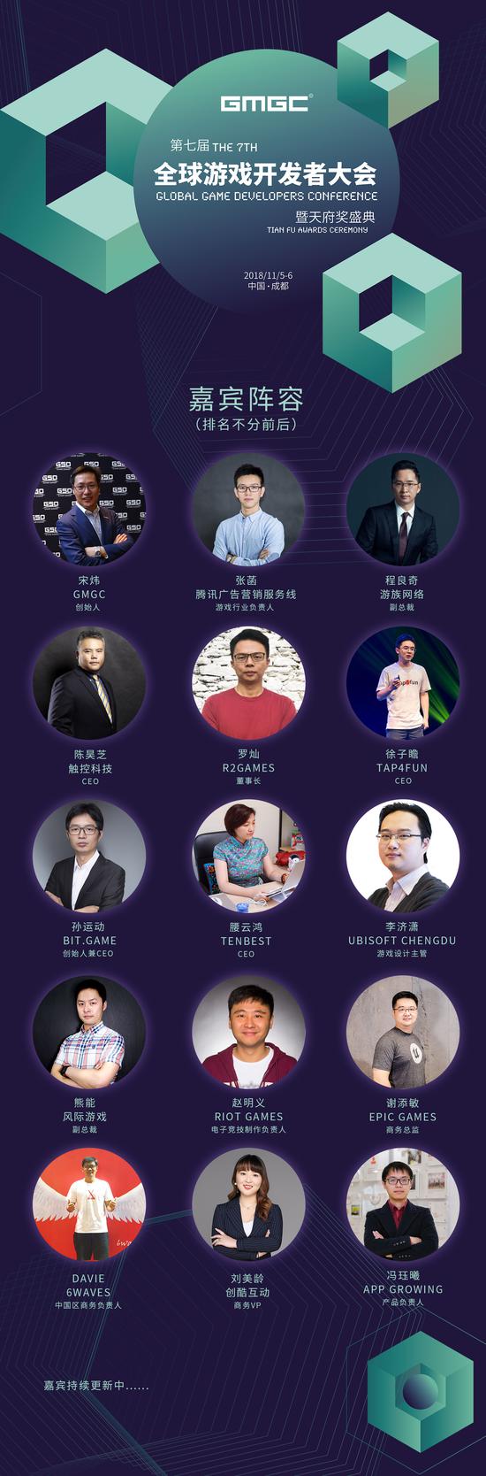 今日,GMGC·成都·2018组委会正式对外公布了首批参会嘉宾阵容(排名不分先后),这些重磅嘉宾中既有来自育碧、游族等顶级游戏企业的大咖,也有陈昊芝这样浸淫业界多年的国内引擎大神,同时也有来自数据分析、广告、游戏设计等领域的技术流代表。以“恋游戏·游戏链”为主题的GMGC·成都·2018大会将汇集包括游戏在内众多相关领域的领军人物,共筑业界盛会。