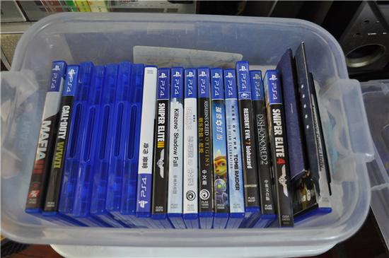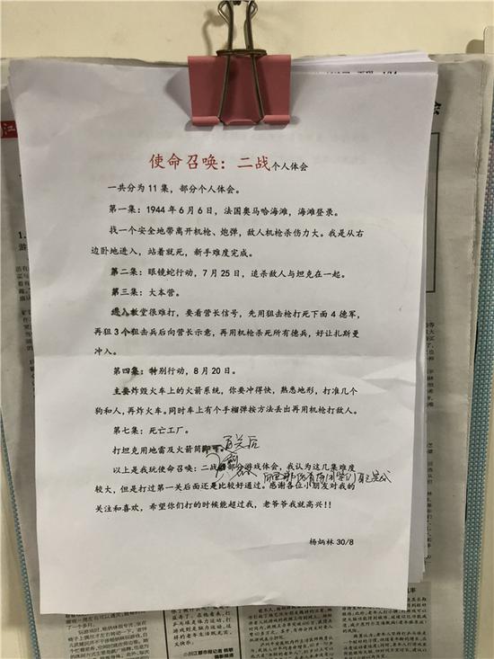 从1998年到现在,老人玩过的光盘卡带都收藏在一个大柜子里保存得很好。在老人的展示下,我们看到了老人丰富的收藏品,据他说,仅通关的游戏就多达500余款。同时,杨老还有一个习惯,会将自己通关的游戏剧情和个人心得记录下来,贴在墙上。