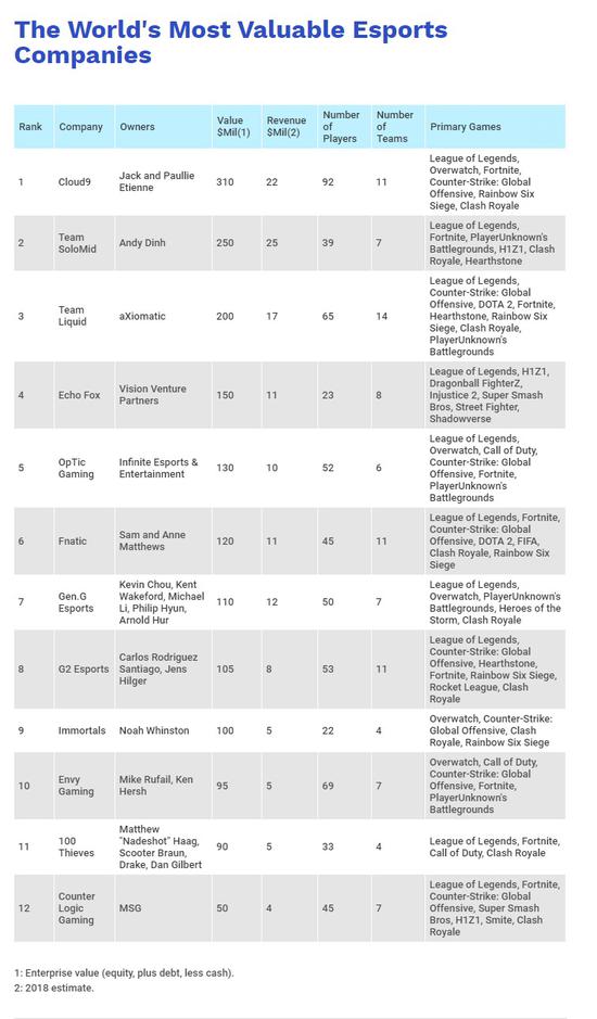 Echo Fox(1.5亿)、OpTic Gaming(1.3亿)、Fnatic(1.2亿)、Gen.G Esports(1.1亿)、Envy Gaming(0.95亿)、100 Thieves(0.9亿)和Counter Logic Gaming(0.5亿)