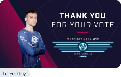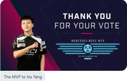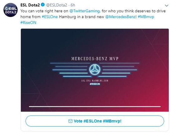 新赛季第一个线下大赛,ESL One汉堡站2018正在如火如荼地进行中,而两支中国战队VG和Aster在小组赛上的成绩都很不错,Aster更是已经提前锁定淘汰赛胜者组的晋级资格。由于与梅赛德斯奔驰达成了战略合作关系,ESL旗下DOTA2赛事从去年开始就新增了冠军MVP奖品——一辆奔驰车。今天,ESL官方在某不存在的社交媒体(Twitter)上开启了汉堡站2018的MVP投票活动。
