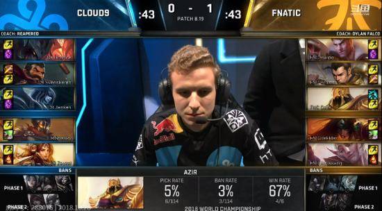 第一局双方放出来了淘汰赛阶段非常OP的妖姬,FNC果断一抢,并拿出三单维克托。C9则拿出冰女和艾克针对。
