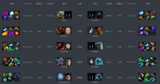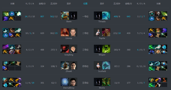 第二局,coL继续拿出精灵飞机与斧王,只不过中单换成了血魔。INF则继续选择卡尔。可以看到,在随后的比赛中INF为自己的不信邪付出了代价。coL三核依旧拿下了豪华的数据,EE SAMA拿下26个助攻,反观INF这边则显得有些惨淡。最终,coL以2:0轻松拿下对手。