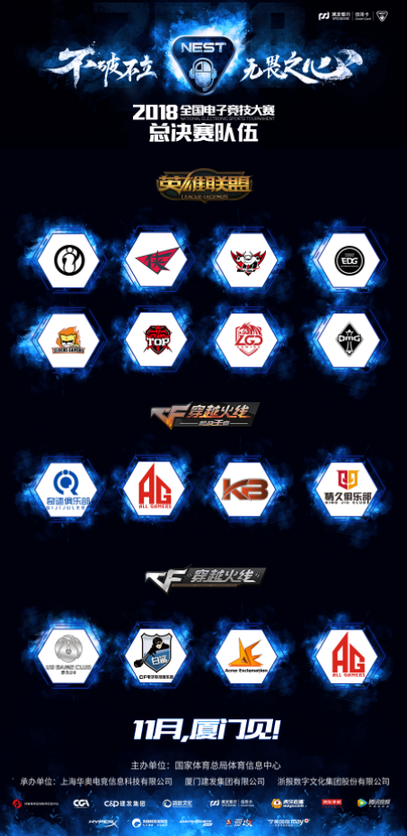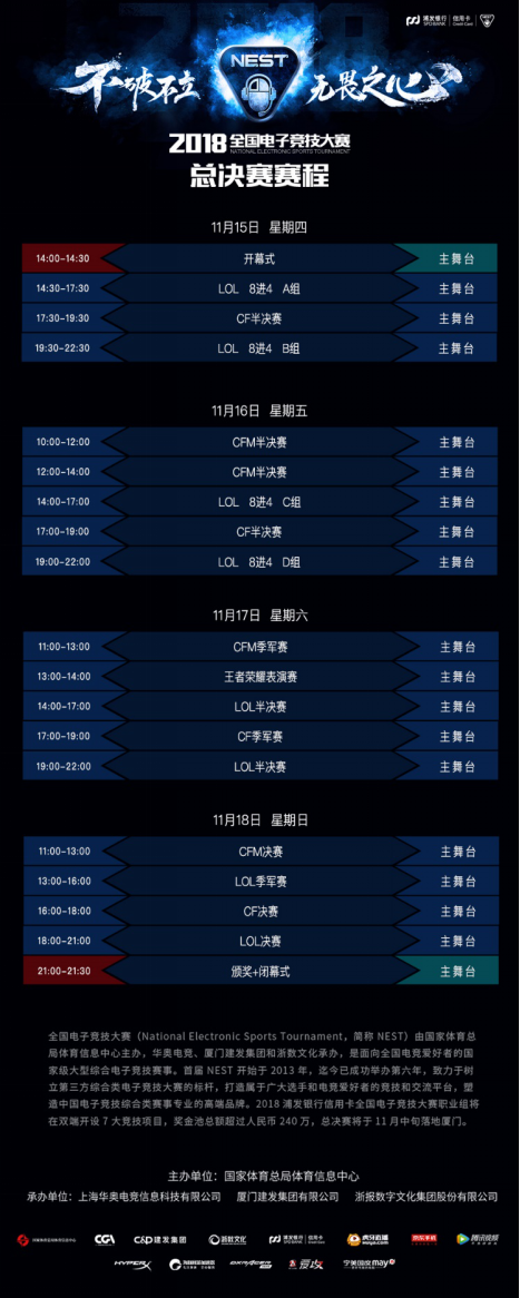 全国电子竞技大赛(National Electronic Sports Tournament,简称 NEST)由国家体育总局体育信息中心主办,华奥电竞、厦门建发集团和浙数文化承办,是面向全国电竞爱好者的国家级大型综合电子竞技赛事。首届 NEST 开始于 2013 年,迄今已成功举办第六年,致力于树立第三方综合类电子竞技大赛的标杆,打造属于广大选手和电竞爱好者的竞技和交流平台,塑造中国电子竞技综合类赛事专业的高端品牌。2018浦发银行信用卡全国电子竞技大赛职业组将在双端开设7大竞技项目,奖金池总额超过人民币240万,总决赛将于11月中旬落地厦门。