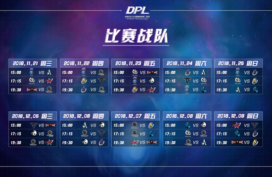 2018 DPL第二赛季常规赛将于11月21至12月9日进行为期2周的争夺。季后赛将在12月28日至12月30日3天内举行。主办方将通过Mars耀宇传媒及火猫直播官方网站、微博、微信及赛事合作媒体渠道公布DPL后续赛事信息,敬请期待!