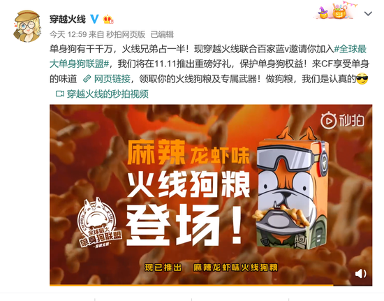 今天,国内知名FPS网游《穿越火线》(以下简称CF)在官微宣布,将为广大CF游戏玩家定制11.11专属“火线狗粮”,这一极具创意又暖心的举动引发诸多网友热议。