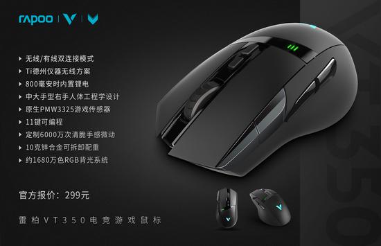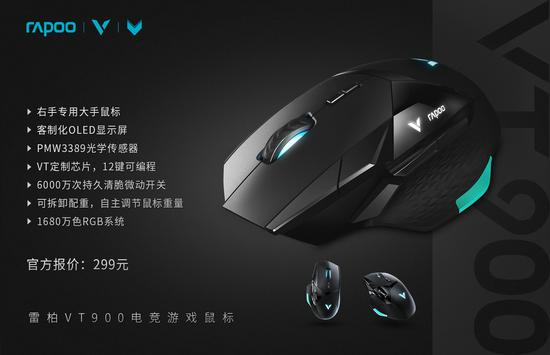 2018年雷柏匠心制造的高端电竞游戏VT系列,黑科技,玩无线。VT950电竞游戏鼠标,PMW3389引擎+客制化OLED显示器+无线/有线双连接模式,将黑科技主流化,让热爱燃烧。