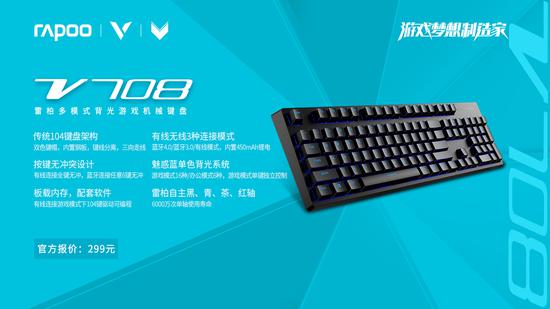 耀世合金,流光幻彩,V700RGB合金版幻彩背光游戏机械键盘彰显其傲人的魅力。蓝牙4.0、蓝牙3.0以及有线共3种连接模式的雷柏V708多模式无线机械键盘,将游戏办公很好的结合在了一起,让你事半功倍,所向披靡。