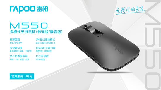 作为硬朗商务的代表,雷柏M550多模式无线鼠标,同样是蓝牙4.0、蓝牙3.0以及无线2.4G共三种的连接模式,纤薄弧面方正的外观设计,一股冷峻硬朗的商务气息展现开来。