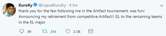 DOTA2知名选手Team Liquid的队长KuroKy在Artifact前瞻比赛上取得四强后,发推特宣布从竞技刀牌领域退役: