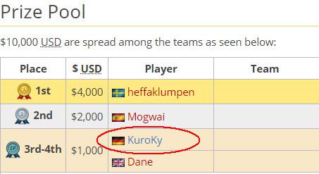 在这次比赛上KuroKy位于并列第四,还拿了1000刀的奖金。