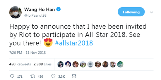 11月12日,LCK KZ战队的打野选手Peanut通过自己的社交平台宣布了一个好消息。那就是Peanut收到了韩国拳头的特殊邀请,也将参加到2018全明星赛中!