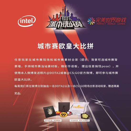 本届城市挑战赛,我们给各位玩家们和来到现场热爱CS:GO和DOTA2的小伙伴们送福利啦~只要拿出手机,在城市赛现场和城市赛素材合影,使用本人照片并@DOTA2或者@CS:GO微博,每周我们将抽取最欧的童鞋给予精美奖品,并公布获奖照片。一起来测血统吧!