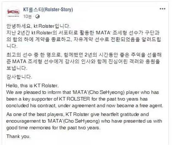 11月13日,KT电子竞技俱乐部发布了一个大消息,战队辅助选手Mata离队成为自由人。