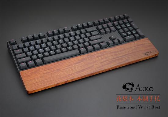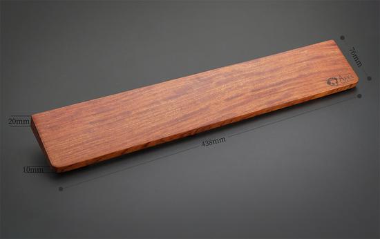 Akko花梨木木制手托目前推出104/108键版本,适配Akko Ducky旗下的108键键盘产品,以及市售的一些全尺寸键盘。手托尺寸为438*76mm,前高10mm,后高20mm,与键盘的键帽坡度契合,使用舒适。
