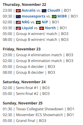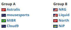 小组赛的分组是根据北美和欧洲区战队成绩来划分的。A组中有着Astralis、mousesports和MIBR,而B组中则是Liquid领衔,还有NRG和NIP紧随其后。
