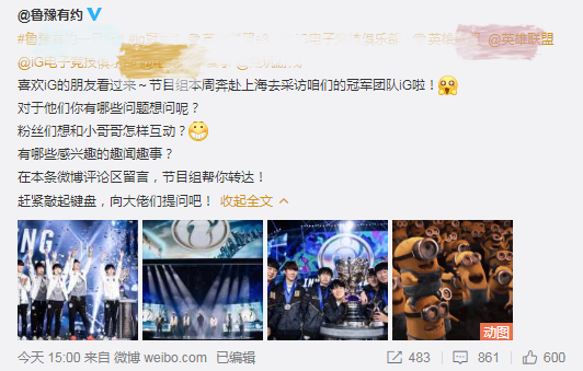 而今天,应该很多人都看过的访谈节目《鲁豫有约》也发出预告,这周要去采访IG战队!
