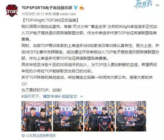 TOP早早地官宣了“黄金左手”Knight加盟的消息,这名天才少年在缺席了一整个夏季赛之后将在S9重新回到赛场。另一名加入TOP的选手则是出自俱乐部青训体系的上单369,他在刚刚结束的NEST上有着不错的表现。