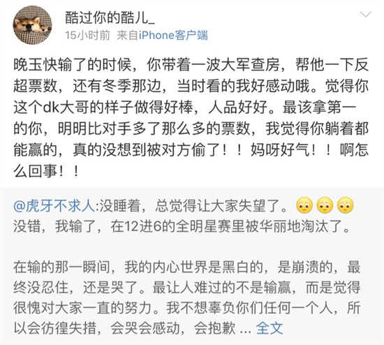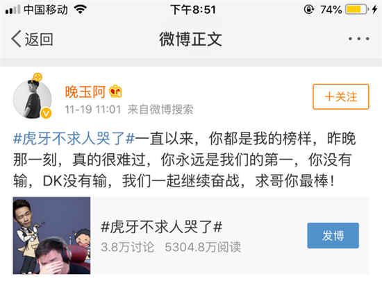 在11月19日中午,晚玉再次发表微博力挺不求人,他表示,一直以来不求人都是DKG的榜样,他永远是DKG心目中的第一。的确,大鹅公会偷塔获得的只是一个晋级名额,而DKG赢得的是人心,不求人作为一名三观正、有担当、有技术的主播,虽败犹荣。