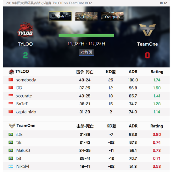 第二场比赛对战巴西四哥TeamOne,TYLOO似乎找回了一点状态。首图火车上somebody爆炸般的发挥帮助队伍上半场守下12分,最终以12-3大比分领先,下半场TeamOne也没有组织起有效的反击,最终TYLOO以16-4轻取第一图。第二图overpass上上半场双方还打得有来有回,先做进攻方的TeamOne依靠长枪局后半程的出色发挥上半场8-7领先一分,但下半场来到进攻方的TeamOne却拿TYLOO的防守毫无办法,最终TYLOO下半场仅让对手攻下两分以16-10拿下第二图,总比分2-0拿到3个积分。