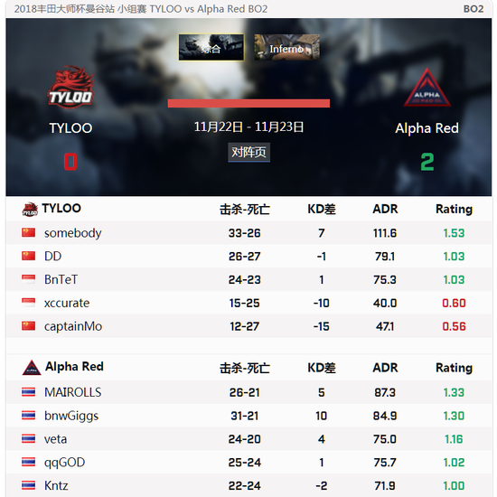 首场比赛TYLOO对战声明不显的泰国本土战队Alpha Red却意外翻车,在首图inferno上TYLOO上半场先做防守方守下10分,但下半场被Alpha Red反击扳回十分将比赛拖入加时,在加时赛中Alpha Red乘胜追击4-1拿下加时,最终以19-16拿下一图。第二图mirage上TYLOO依然延续了他们糟糕的状态,上半场先做进攻方攻下六分,下半场将比分追至13-13后输掉关键局被Alpha Red先拿到赛点,并最终以14-16输掉第二图,总比分0-2爆冷不敌Alpha Red。