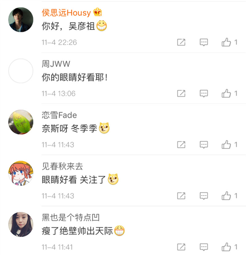 其实在这之前,冬季就曾自称为吴彦祖,这次看到冬季晒电眼,评论区瞬间马屁泛滥。“你好,吴彦祖”、“你的眼睛好看耶”、“贼帅了”等等一系列夸奖的言语出现在了这条微博的评论区里,不知冬季看了以后有没有暗自窃喜,没想到我的电眼这么有魅力!