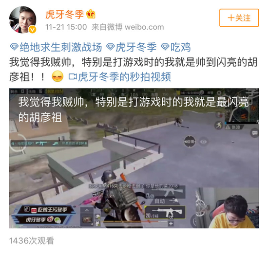 在11月21日下午,小编发现冬季又上传了一段自己在刺激战场里虐杀全场的视频,还十分高调地说道:“我觉得我贼帅,特别是打游戏时的我就是帅到闪亮的胡彦祖!”不知道大家有没有找到这条微博里的关键词,没错,就是胡彦祖,原来我们关注了这么久的冬季,姓胡,虽然姓胡,可他打起游戏来可一点都不含胡(糊)!