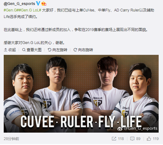 大家好,我们已经与上单CuVee、中单Fly、AD Carry Ruler以及辅助Life选手完成了续约。